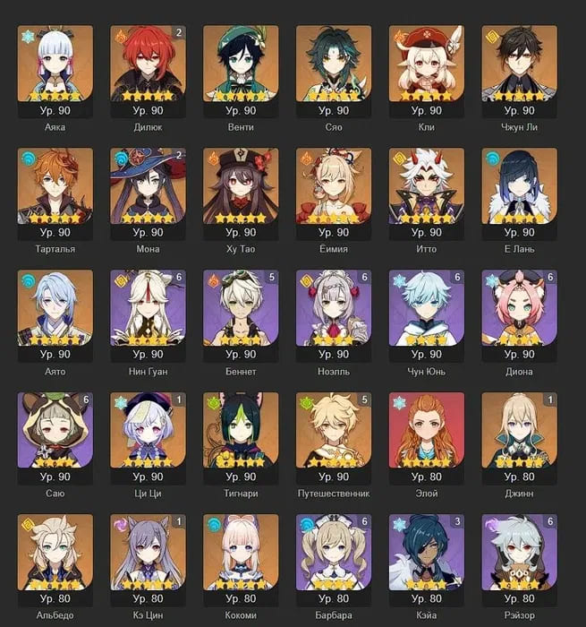 🧍♀️ Персонажи: Дилюк, Ху Тао, Мона, Аяка, Е Лань, Чжун Ли, Тарталья, Ёимия, Тигнари, Ци Ци и другие